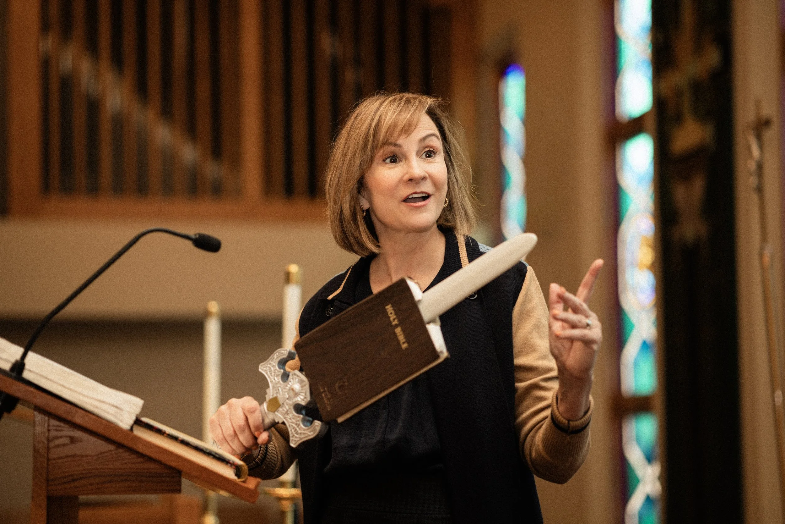 Debbie’s theatrical background makes her messages fun and meaningful. She’s known for using props over PowerPoint. It may be that you’ll meet Annie Oakley- armed and ready to share God’s peace. Or perhaps Super Susie Christian with her hard hat and plank screwed to the side, so you can see your need to get the log of judgement out of your own eye first in order to see clearly to love others. Debbie has God’s Word and she’s not afraid to use it to bring God’s Good News to you.